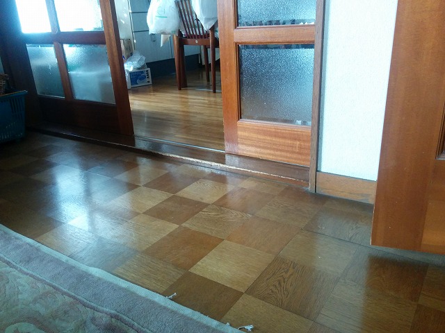 確認にお伺いしたところ、下地の根太・大引き等の不具合ではなく、仕上げに貼ってあるフローリングの経年劣化が原因のようでした。